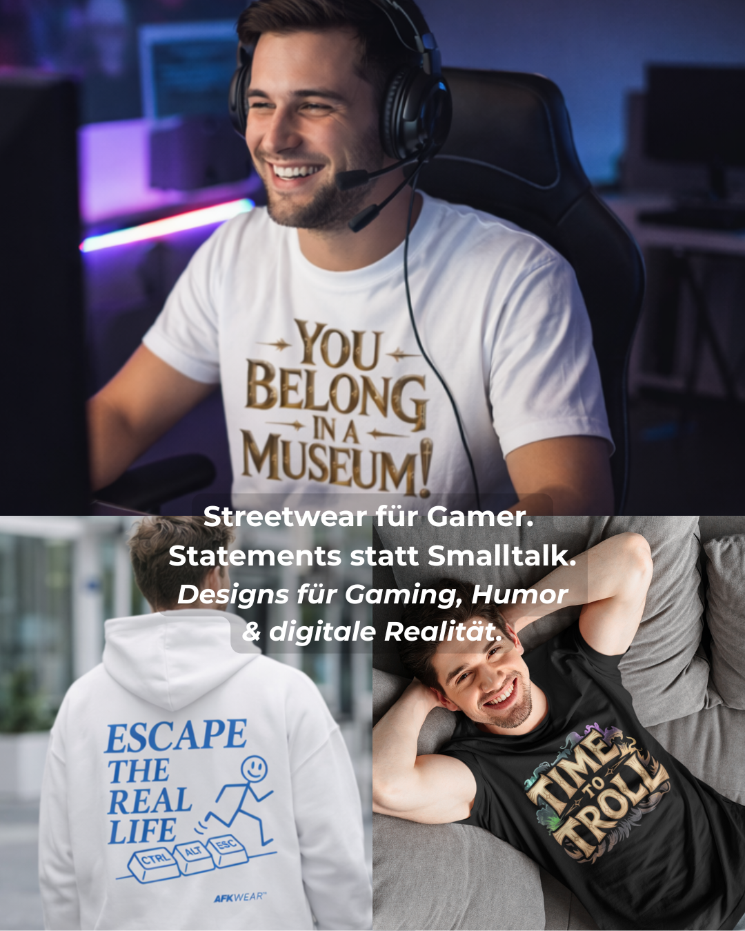Ich habe AFK WEAR gegründet, weil ich keine Lust mehr hatte auf Shirts, die entweder zu generisch, zu laut oder einfach nicht ehrlich waren. Ich wollte Streetwear, die Gaming feiert, ohne Klischees. Mit Sprüchen, die man fühlt, weil sie echte Momente widerspiegeln: Motivation im Keller, Ironie als Schutzschild, Humor als Statement.